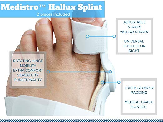 • ? ORTHOPEDIC RELIEF – Our Medistro Corrector toe straightener splint is designed to relieve you from the pain caused by your Bunion on your Big Toe. We have designed it to fit comfortably on any foot and our hinge allows for natural movements while wearing it. The velcro straps can be used to adjust the amount of pressure on your bunion because not all bunions are created equal.